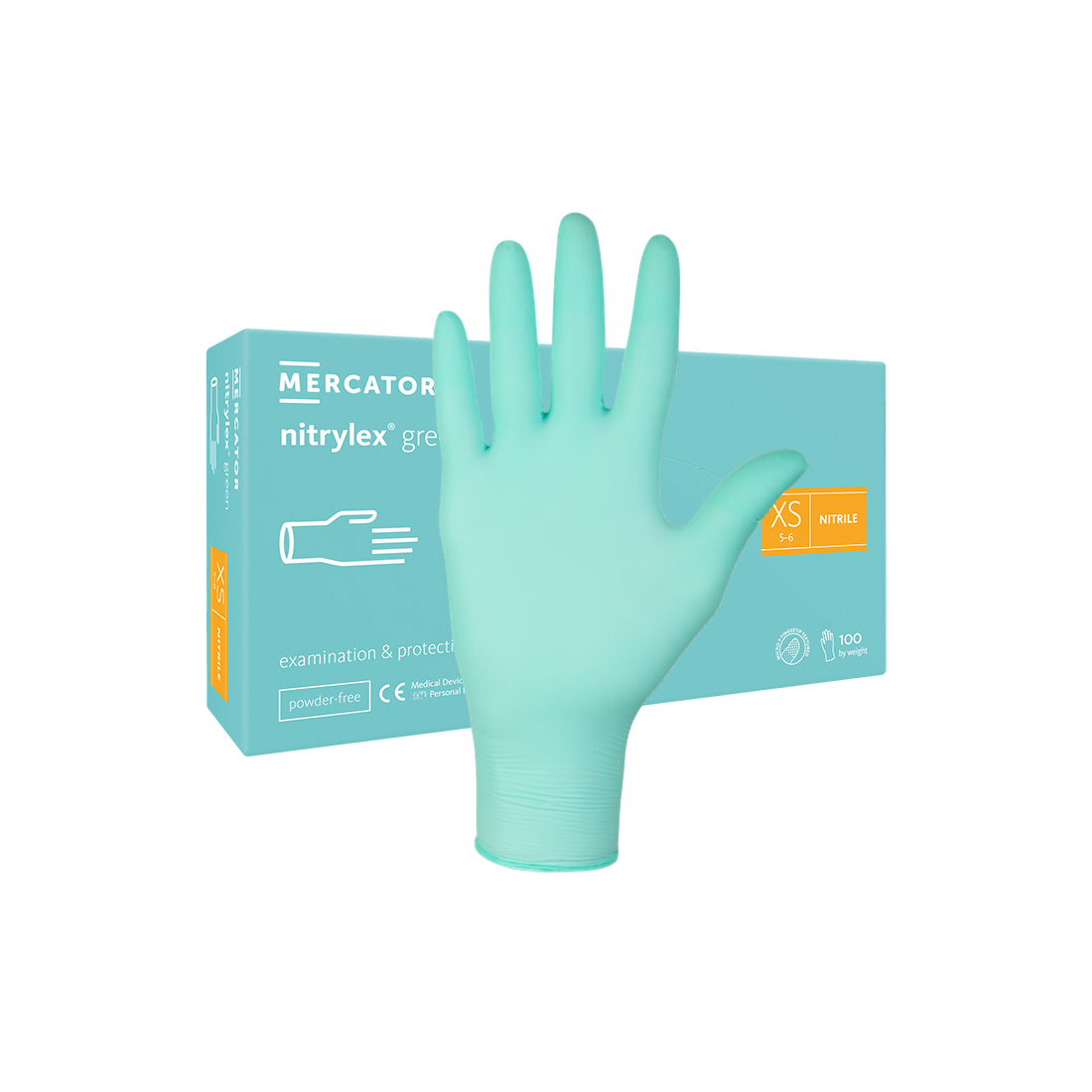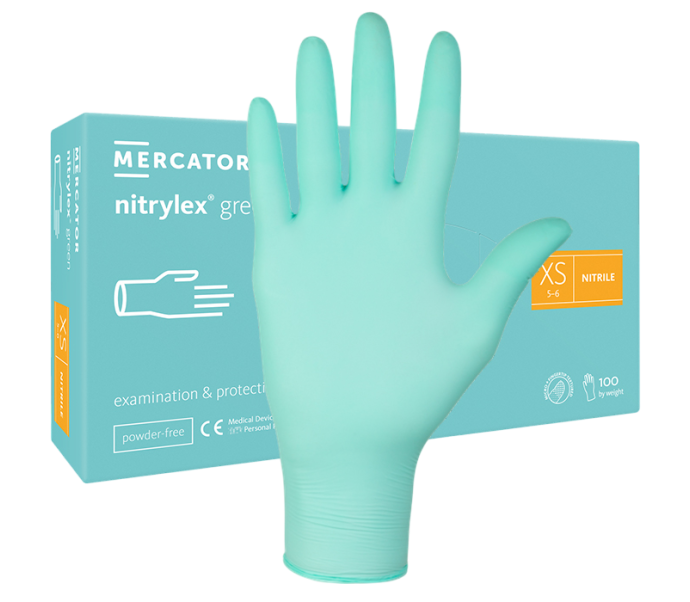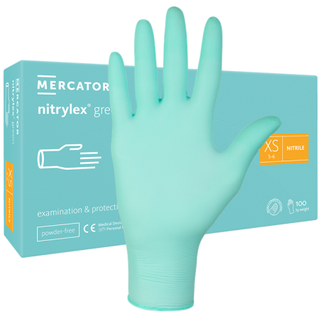 Nitrilinės vienkartinės pirštinės NITRYLEX GREEN, žalios, XS dydis, 100 vnt. Be latekso ir pudros, tinka jautriai odai.