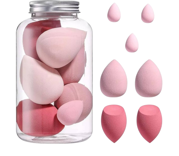 Rinkinį sudaro 7 makiažo kempinėlės patogiame indelyje su dangteliu – 4 didelės „beauty blender“ tipo kempinėlės ir 3 mini dydžio kempinėlės. Didesnė apatinė dalis leidžia greitai padengti didesnius veido plotus, o smaili viršūnė užtikrina tikslų priėjimą prie sunkiai pasiekiamų vietų. Kempinėlės padeda išgauti glotnų, natūralų, „airbrush“ efektą.