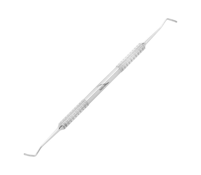 Rowkowanie na powierzchni uchwytu zapewnia pewny i stabilny chwyt, zapobiegając ślizganiu się narzędzia podczas precyzyjnych zabiegów. Estetyczne wykonanie kopytka, z dbałością o detale, nadaje narzędziu profesjonalny wygląd, który doskonale wpisuje się w standardy nowoczesnych gabinetów. Narzędzie wykonano z wysokiej jakości stali nierdzewnej, dzięki czemu jest trwałe, odporne na uszkodzenia i łatwe do utrzymania w czystości. Można je poddawać sterylizacji w autoklawie, co czyni je idealnym wyborem do wielokrotnego użytku w profesjonalnych warunkach.
