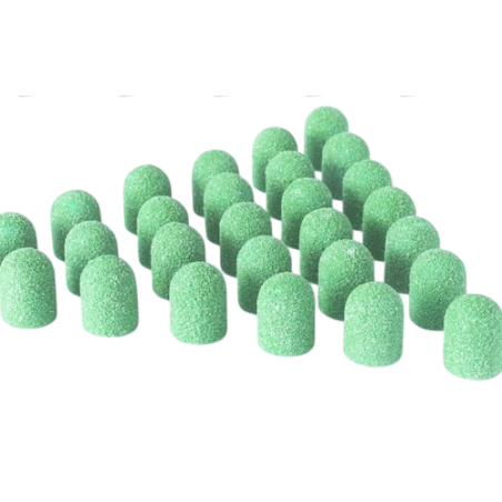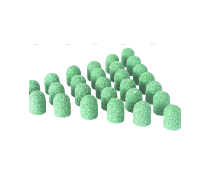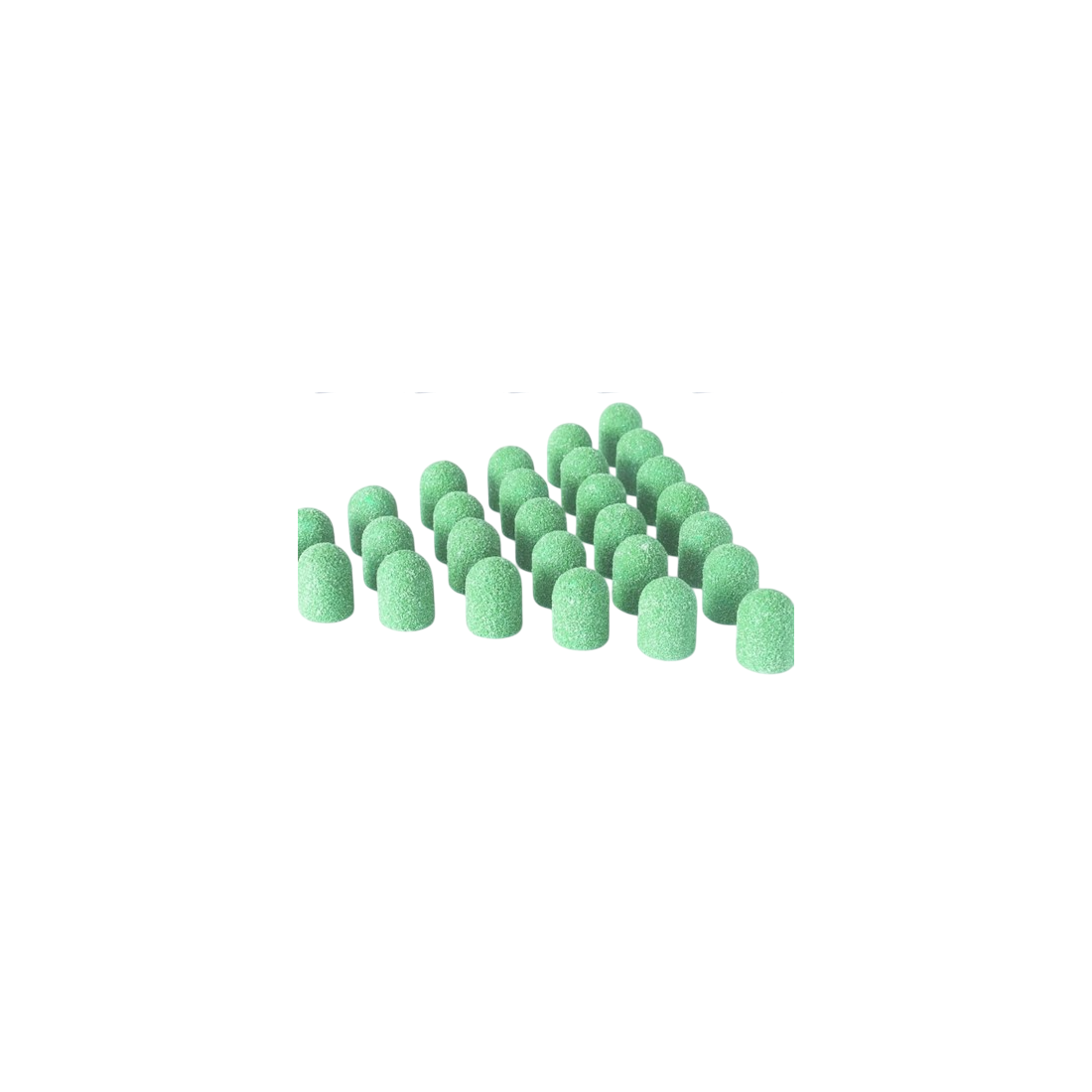 Vienkartiniai pedikiūro antgaliai–kepurėlės, žalios, 10 mm, 150 grit, 100 vnt. – itin švelniam odos poliravimui ir lyginimui pedikiūro metu.